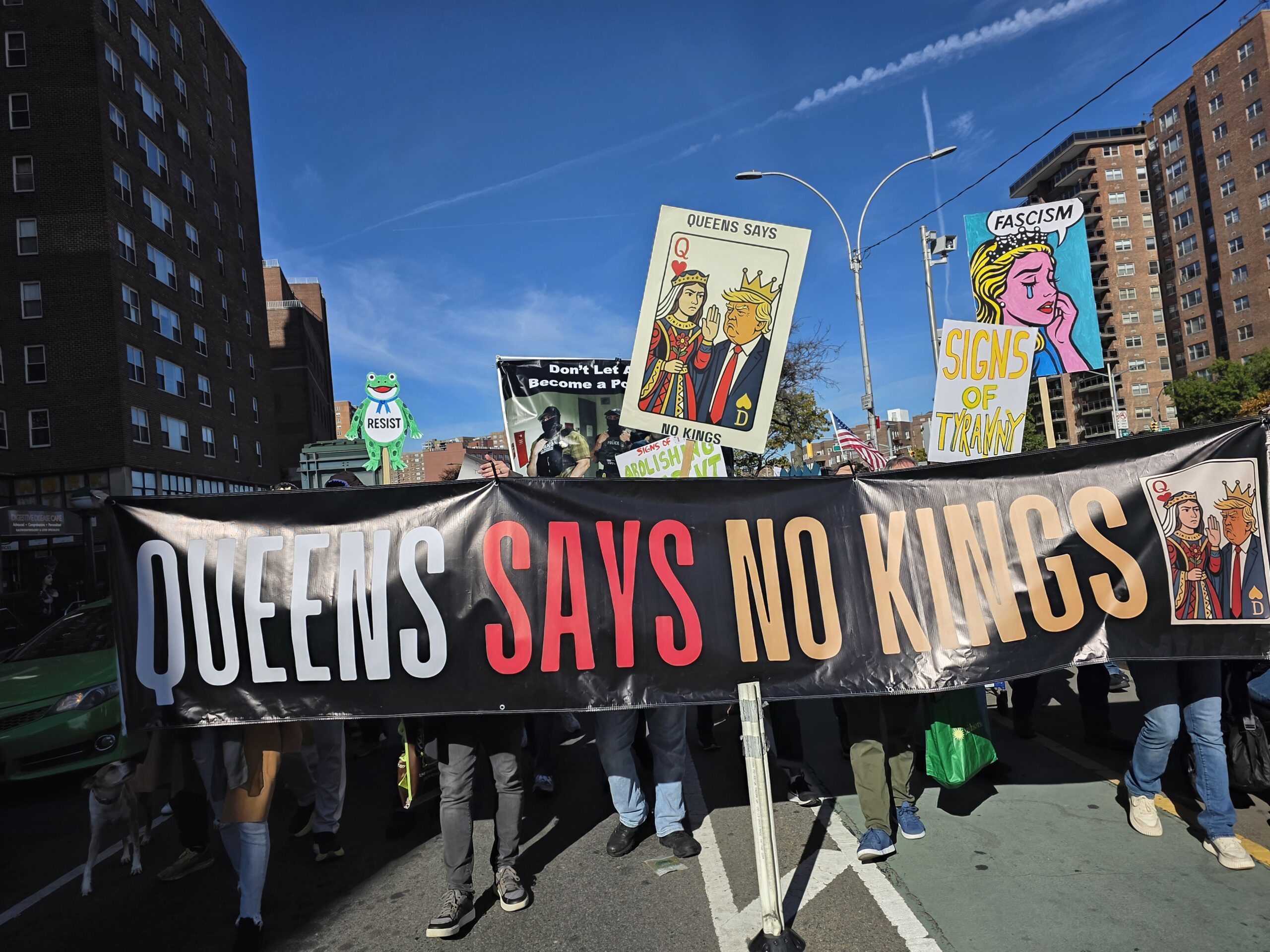 In New York City actions organized in Queens, that consistency is paired with place-specific imagery. Large front banners name the borough directly, while recurring illustrated elements—most notably the Resist Flower—appear at scale and are elevated above the crowd, serving as visual anchors. These images carry identity as much as text. The action can be recognized without reading anything at all.